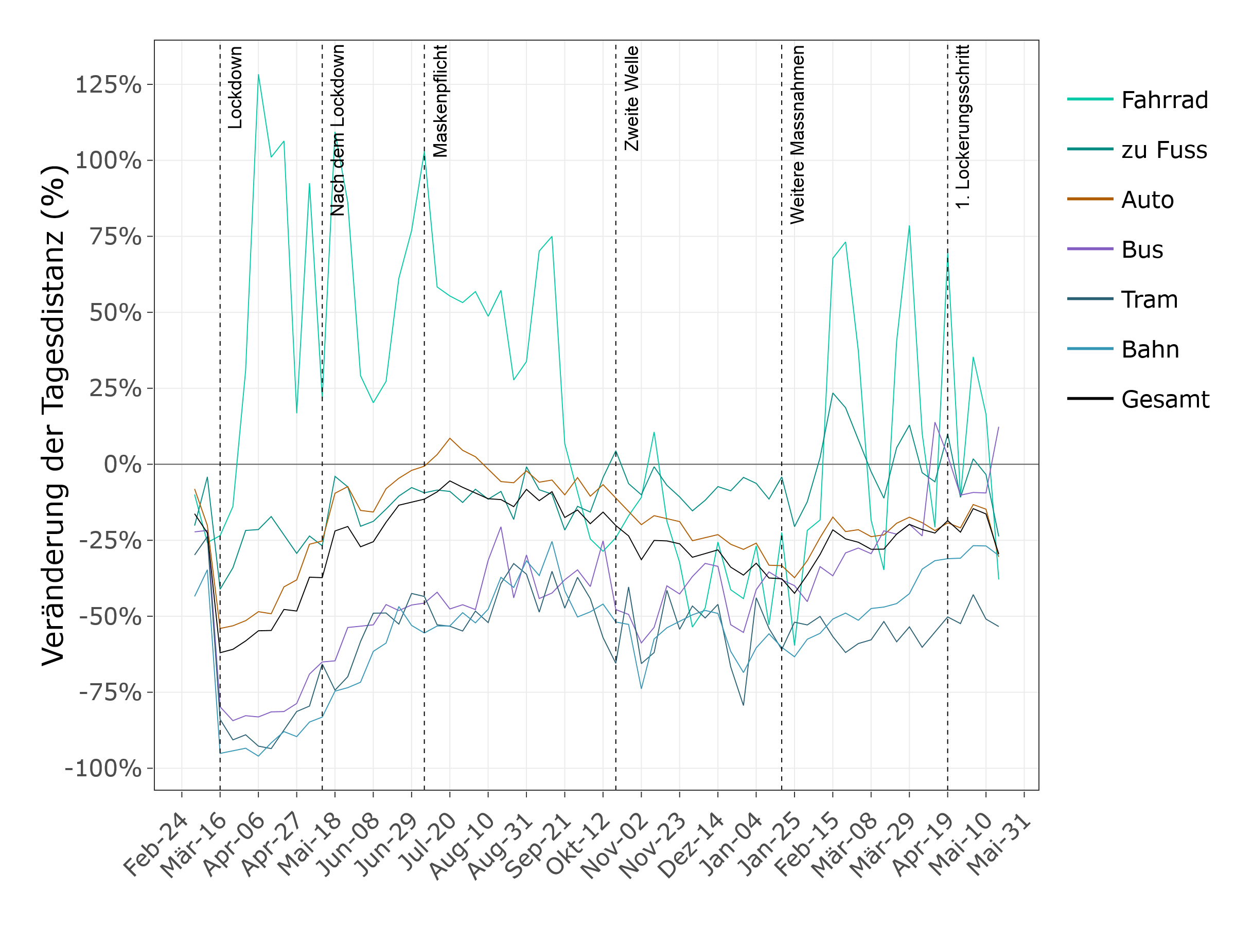 Figure 1 visualises the daily distance travelled by different modes of transport over time in Switzerland. The distance travelled by bicycle even increased rapidly after the first lockdown in March 2020. The change in daily distance for bicycles is negative over the winter months. But it increased again for spring 2021 4.